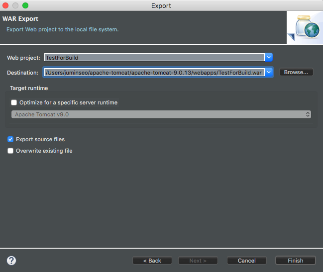 3. Destination 으로 tomcat 디렉터리 밑의 webapps/ 아래 해당 war 파일을 위치시킨다.